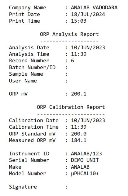 • Analysis Data Storage : More than 500 analysis data which can be viewed & Print, company name, analysis date & time, record number, *Username, *Sample Name, *Bath Number/ID, pH, mV, temperature reading, Corresponding Calibration Data, instrument serial number, Instrument Make & Model & *Signature etc. Secondly, analysis data can be print online without saving analysis data in Instrument.